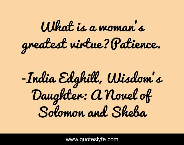 This page presents the quote "What is a woman's greatest virtue?Patience.". Author of this quote is India Edghill, Wisdom's Daughter: A Novel of Solomon and Sheba. This quote is about patience, woman, virtues,.