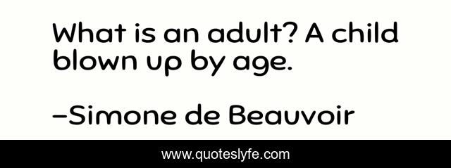 This page presents the quote "What is an adult? A child blown up by age.". Author of this quote is Simone de Beauvoir. This quote is about child, up, adult,.