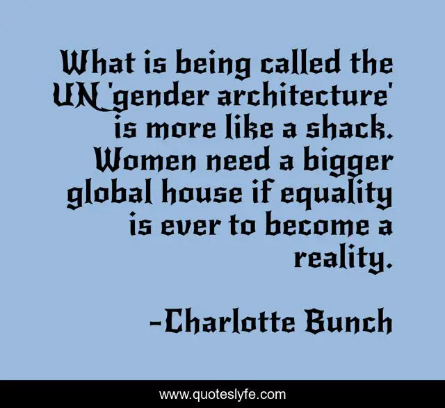 This page presents the quote "What is being called the UN 'gender architecture' is more like a shack. Women need a bigger global house if equality is ever to become a reality.". Author of this quote is Charlotte Bunch. This quote is about women, architecture, reality,.