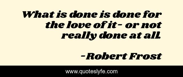 This page presents the quote "What is done is done for the love of it- or not really done at all.". Author of this quote is Robert Frost. This quote is about confidence, love, positive, motivational, passion, optimistic, inspirational, enthusiasm, affection,.