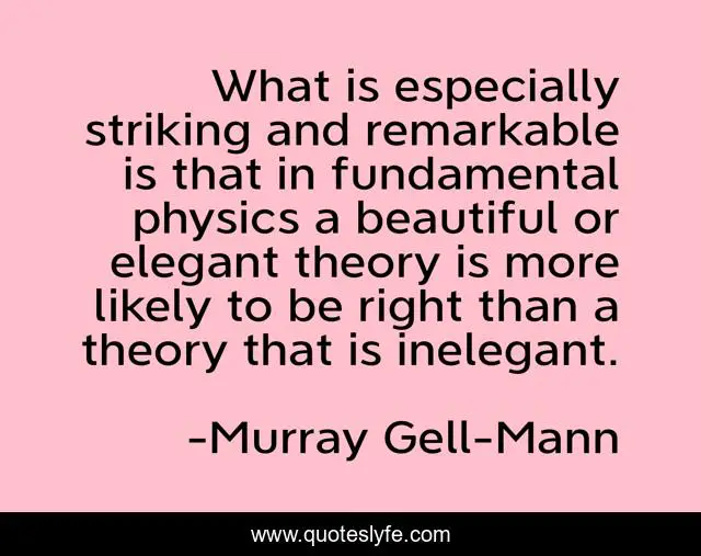 This page presents the quote "What is especially striking and remarkable is that in fundamental physics a beautiful or elegant theory is more likely to be right than a theory that is inelegant.". Author of this quote is Murray Gell-Mann. This quote is about science, aesthetics, physics, theory, beauty,.