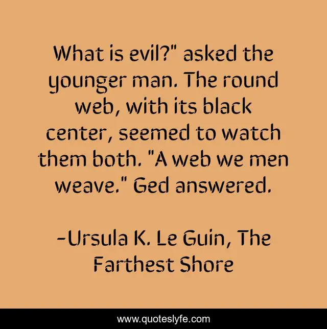 This page presents the quote "What is evil?" asked the younger man. The round web, with its black center, seemed to watch them both. "A web we men weave." Ged answered.". Author of this quote is Ursula K. Le Guin, The Farthest Shore. .