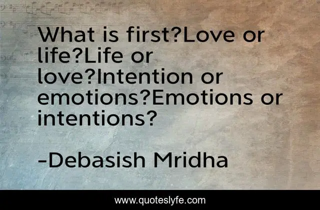 This page presents the quote "What is first?Love or life?Life or love?Intention or emotions?Emotions or intentions?". Author of this quote is Debasish Mridha. This quote is about life, love, knowledge, inspirational, intelligence, philosophy, wisdom, quotes, affection,.