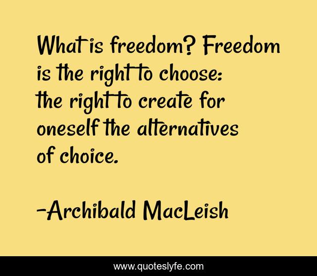 This page presents the quote "What is freedom? Freedom is the right to choose: the right to create for oneself the alternatives of choice.". Author of this quote is Archibald MacLeish. This quote is about create, right, choice,.