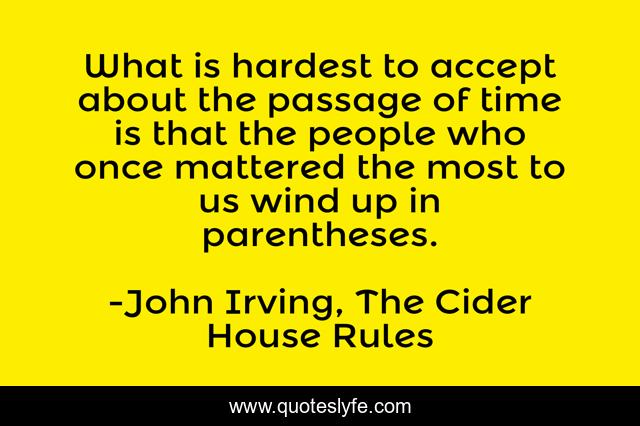 This page presents the quote "What is hardest to accept about the passage of time is that the people who once mattered the most to us wind up in parentheses.". Author of this quote is John Irving, The Cider House Rules. This quote is about living, sad,.