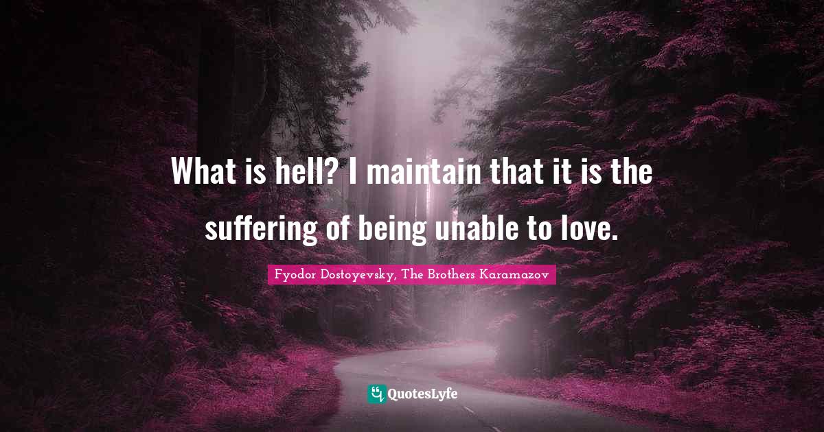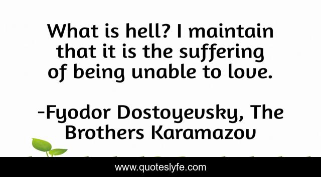 This page presents the quote "What is hell? I maintain that it is the suffering of being unable to love.". Author of this quote is Fyodor Dostoyevsky, The Brothers Karamazov. This quote is about hell, suffering, love, affection,.