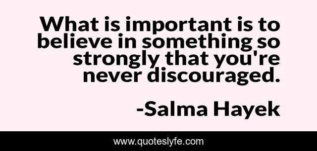 This page presents the quote "What is important is to believe in something so strongly that you're never discouraged.". Author of this quote is Salma Hayek. This quote is about believe, important,.