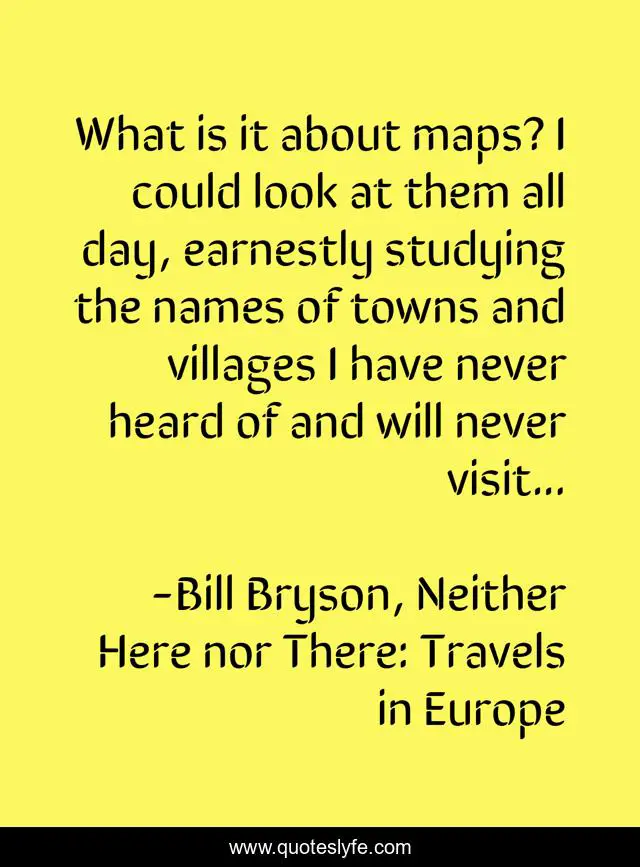 This page presents the quote "What is it about maps? I could look at them all day, earnestly studying the names of towns and villages I have never heard of and will never visit...". Author of this quote is Bill Bryson, Neither Here nor There: Travels in Europe. .
