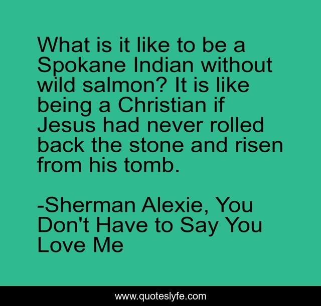 This page presents the quote "What is it like to be a Spokane Indian without wild salmon? It is like being a Christian if Jesus had never rolled back the stone and risen from his tomb.". Author of this quote is Sherman Alexie, You Don't Have to Say You Love Me. This quote is about loss, native-americans, nature,.