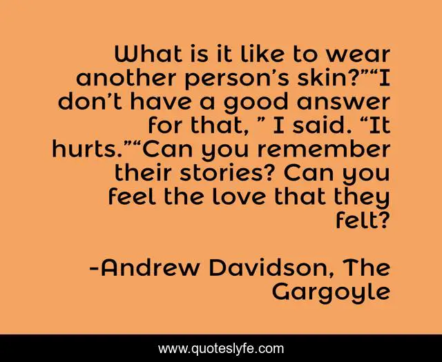 This page presents the quote "What is it like to wear another person’s skin?”“I don’t have a good answer for that, ” I said. “It hurts.”“Can you remember their stories? Can you feel the love that they felt?". Author of this quote is Andrew Davidson, The Gargoyle. This quote is about love, memory, pain, affection, skin,.