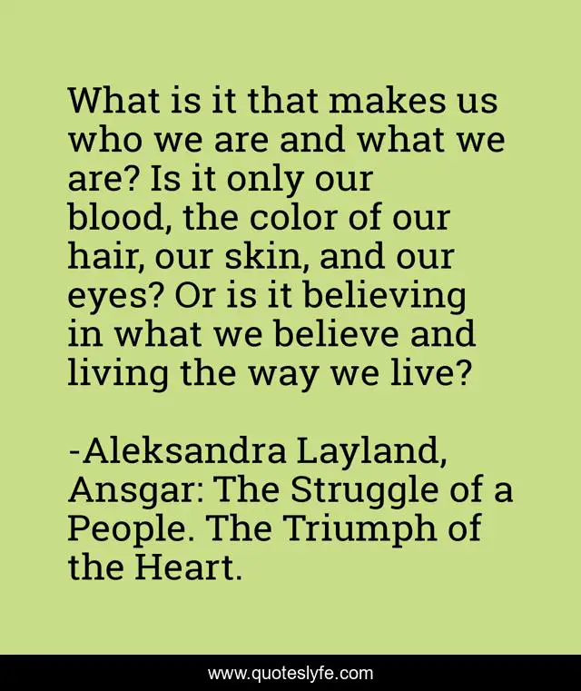 This page presents the quote "What is it that makes us who we are and what we are? Is it only our blood, the color of our hair, our skin, and our eyes? Or is it believing in what we believe and living the way we live?". Author of this quote is Aleksandra Layland, Ansgar: The Struggle of a People. The Triumph of the Heart.. This quote is about belief, unity-of-all-people, racism, beliefs, unity, racism-and-culture, humanity, belief-in-humanity,.