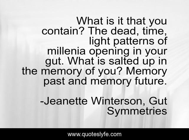 This page presents the quote "What is it that you contain? The dead, time, light patterns of millenia opening in your gut. What is salted up in the memory of you? Memory past and memory future.". Author of this quote is Jeanette Winterson, Gut Symmetries. This quote is about memories, love-hurts, metaphors, time,.