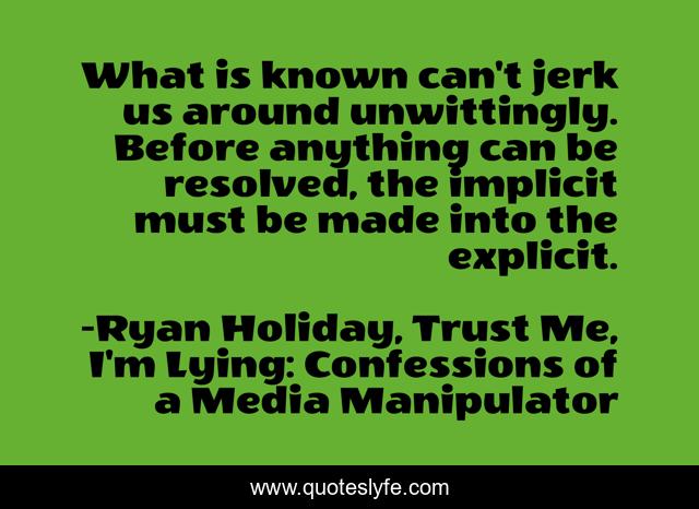 This page presents the quote "What is known can't jerk us around unwittingly. Before anything can be resolved, the implicit must be made into the explicit.". Author of this quote is Ryan Holiday, Trust Me, I'm Lying: Confessions of a Media Manipulator. This quote is about explicit, resolution, implicit, awareness,.