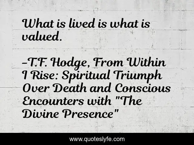 "T.F. Hodge, From Within I Rise: Spiritual Triumph Over Death and Conscious Encounters with "The Divine Presence" Quotes." Quoteslyfe.com, 2025. Sat. 06 Dec. 2025. <https://www.quoteslyfe.com/quote/What-is-lived-is-what-is-valued-158849>.