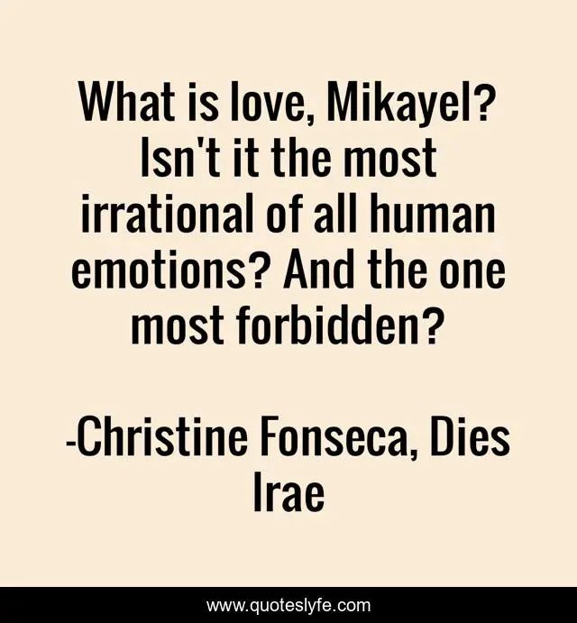This page presents the quote "What is love, Mikayel? Isn't it the most irrational of all human emotions? And the one most forbidden?". Author of this quote is Christine Fonseca, Dies Irae. This quote is about angels-and-demons, love-hurts,.