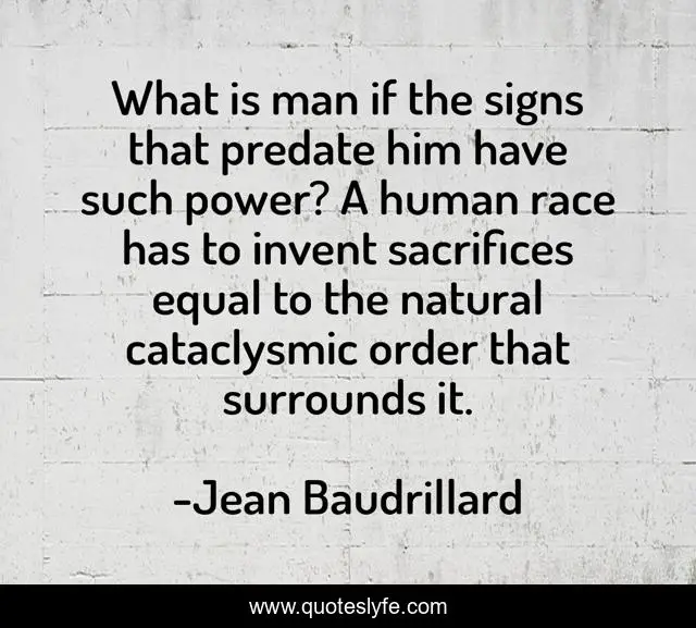 This page presents the quote "What is man if the signs that predate him have such power? A human race has to invent sacrifices equal to the natural cataclysmic order that surrounds it.". Author of this quote is Jean Baudrillard. This quote is about religion, ritual, nature,.