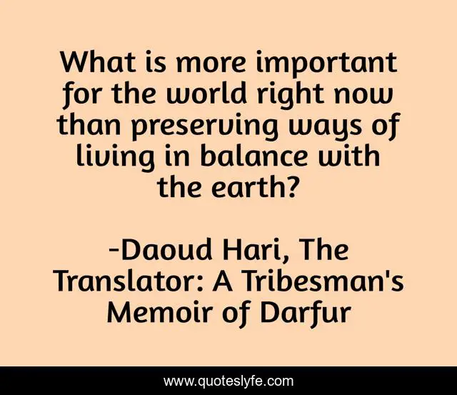 This page presents the quote "What is more important for the world right now than preserving ways of living in balance with the earth?". Author of this quote is Daoud Hari, The Translator: A Tribesman's Memoir of Darfur. This quote is about africa, darfur, the-translator, education, conflict-resolution, inspiration,.
