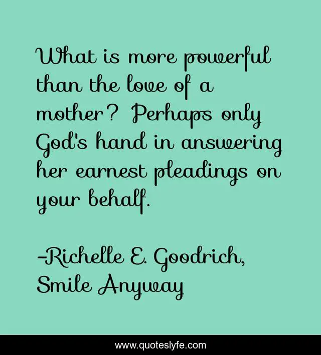 This page presents the quote "What is more powerful than the love of a mother? Perhaps only God's hand in answering her earnest pleadings on your behalf.". Author of this quote is Richelle E. Goodrich, Smile Anyway. This quote is about love, prayers, god, mother-s-day, raising-children, motherhood, richelle, mom, mother,.