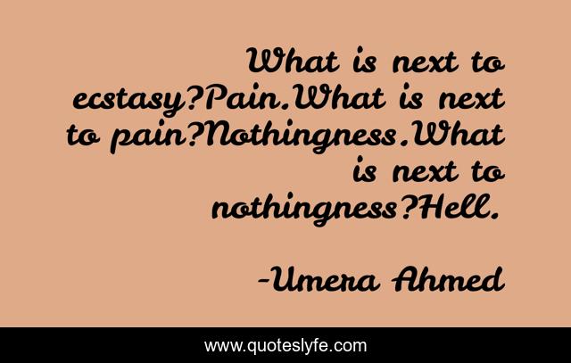 This page presents the quote "What is next to ecstasy?Pain.What is next to pain?Nothingness.What is next to nothingness?Hell.". Author of this quote is Umera Ahmed. This quote is about hell, ecstasy, pain, nothingness, peer-e-kamil,.