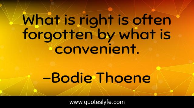 This page presents the quote "What is right is often forgotten by what is convenient.". Author of this quote is Bodie Thoene. This quote is about right, decisions, choices,.