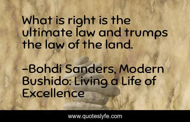 This page presents the quote "What is right is the ultimate law and trumps the law of the land.". Author of this quote is Bohdi Sanders, Modern Bushido: Living a Life of Excellence. This quote is about confidence, right, positive, motivational, do-what-is-right, optimistic, right-and-wrong, law, laws,.