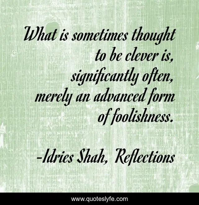 This page presents the quote "What is sometimes thought to be clever is, significantly often, merely an advanced form of foolishness.". Author of this quote is Idries Shah, Reflections. This quote is about forms, clever, advanced, foolishness, illusion,.
