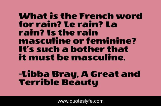 This page presents the quote "What is the French word for rain? Le rain? La rain? Is the rain masculine or feminine? It’s such a bother that it must be masculine.". Author of this quote is Libba Bray, A Great and Terrible Beauty. This quote is about new-languages, men, french,.