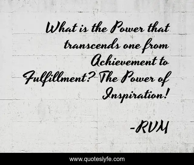This page presents the quote "What is the Power that transcends one from Achievement to Fulfillment? The Power of Inspiration!". Author of this quote is RVM. This quote is about motivation, inspiration,.