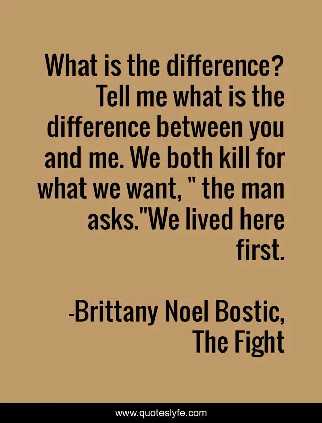 This page presents the quote "What is the difference? Tell me what is the difference between you and me. We both kill for what we want, " the man asks."We lived here first.". Author of this quote is Brittany Noel Bostic, The Fight. This quote is about brittany-noel-bostic, america, love, army, fight, boxing, tommie, killing, book,.
