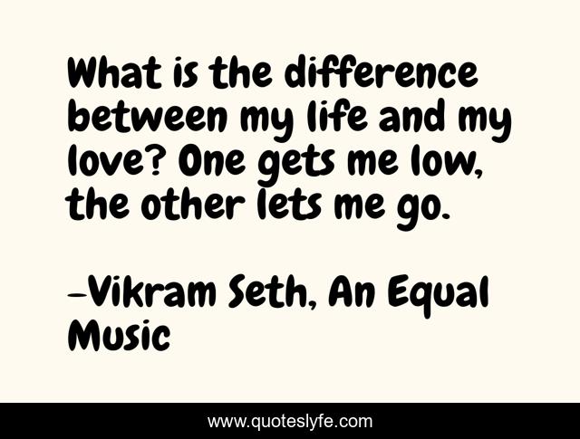 This page presents the quote "What is the difference between my life and my love? One gets me low, the other lets me go.". Author of this quote is Vikram Seth, An Equal Music. This quote is about loss, life, love, affection,.