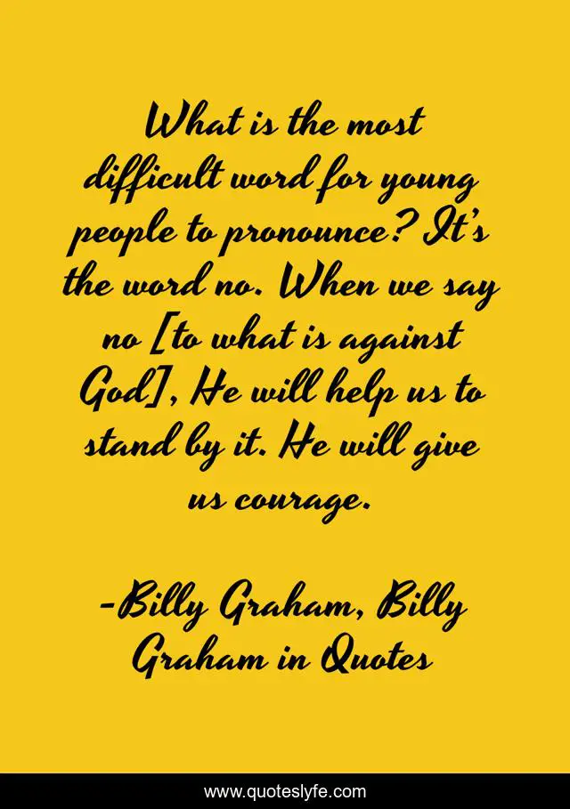 This page presents the quote "What is the most difficult word for young people to pronounce? It’s the word no. When we say no [to what is against God], He will help us to stand by it. He will give us courage.". Author of this quote is Billy Graham, Billy Graham in Quotes. This quote is about young-people, billy-graham,.