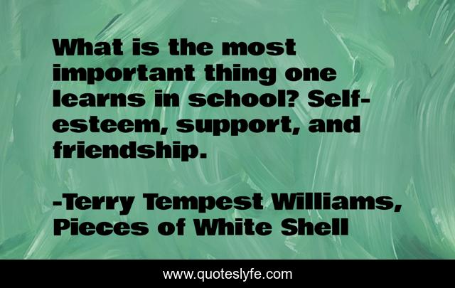 This page presents the quote "What is the most important thing one learns in school? Self-esteem, support, and friendship.". Author of this quote is Terry Tempest Williams, Pieces of White Shell. This quote is about lessons, school, education,.