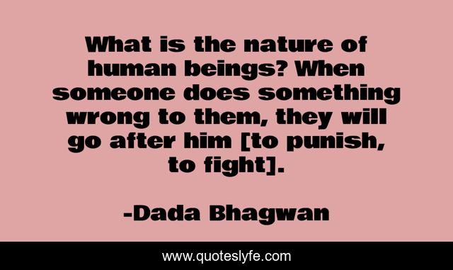 This page presents the quote "What is the nature of human beings? When someone does something wrong to them, they will go after him [to punish, to fight].". Author of this quote is Dada Bhagwan. This quote is about punish, spiritual, human-beings, fight,.