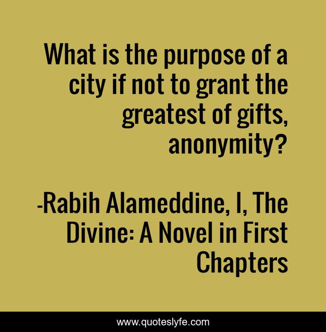 This page presents the quote "What is the purpose of a city if not to grant the greatest of gifts, anonymity?". Author of this quote is Rabih Alameddine, I, The Divine: A Novel in First Chapters. This quote is about anonymity, city,.