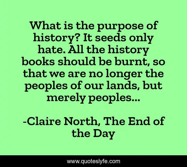 This page presents the quote "What is the purpose of history? It seeds only hate. All the history books should be burnt, so that we are no longer the peoples of our lands, but merely peoples...". Author of this quote is Claire North, The End of the Day. This quote is about books, history, people,.