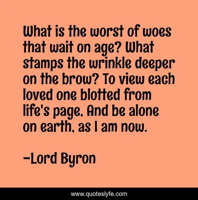 This page presents the quote "What is the worst of woes that wait on age? What stamps the wrinkle deeper on the brow? To view each loved one blotted from life's page, And be alone on earth, as I am now.". Author of this quote is Lord Byron. This quote is about life, age,.
