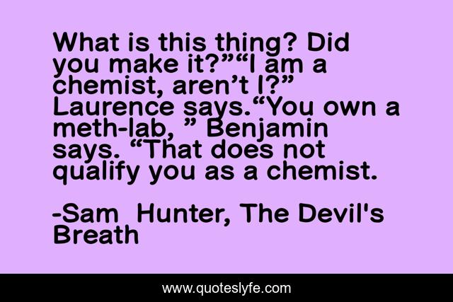 This page presents the quote "What is this thing? Did you make it?”“I am a chemist, aren’t I?” Laurence says.“You own a meth-lab, ” Benjamin says. “That does not qualify you as a chemist.". Author of this quote is Sam Hunter, The Devil's Breath. This quote is about drugs, drug-abuse, humor,.