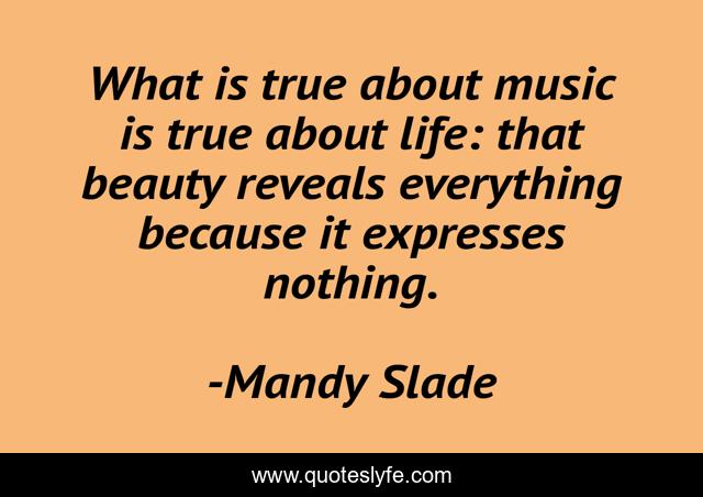 This page presents the quote "What is true about music is true about life: that beauty reveals everything because it expresses nothing.". Author of this quote is Mandy Slade. This quote is about velvet-goldmine, music, beauty,.
