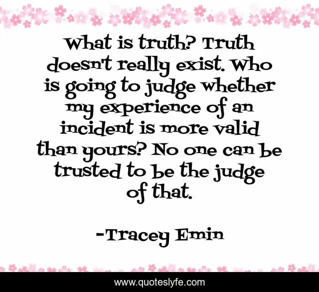 This page presents the quote "What is truth? Truth doesn't really exist. Who is going to judge whether my experience of an incident is more valid than yours? No one can be trusted to be the judge of that.". Author of this quote is Tracey Emin. This quote is about judge, experience, trusted,.