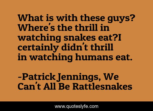 This page presents the quote "What is with these guys? Where's the thrill in watching snakes eat?I certainly didn't thrill in watching humans eat.". Author of this quote is Patrick Jennings, We Can't All Be Rattlesnakes. This quote is about animals, humans, humor, eating, snakes,.