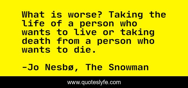 This page presents the quote "What is worse? Taking the life of a person who wants to live or taking death from a person who wants to die.". Author of this quote is Jo Nesbø, The Snowman. This quote is about life, death, morals,.