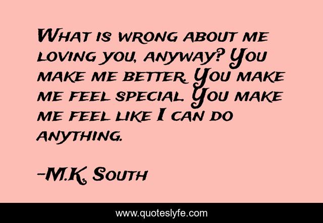This page presents the quote "What is wrong about me loving you, anyway? You make me better. You make me feel special. You make me feel like I can do anything.". Author of this quote is M.K. South. This quote is about love, affection,.