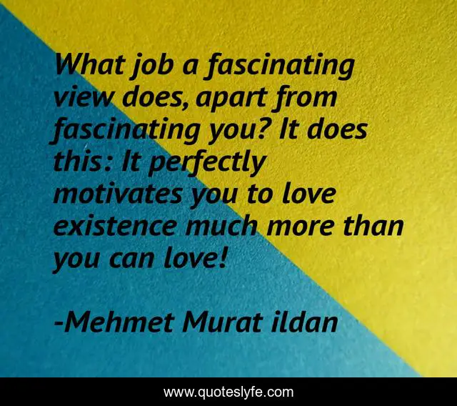 This page presents the quote "What job a fascinating view does, apart from fascinating you? It does this: It perfectly motivates you to love existence much more than you can love!". Author of this quote is Mehmet Murat ildan. This quote is about love, fascinating, motivate, existence, affection, view,.