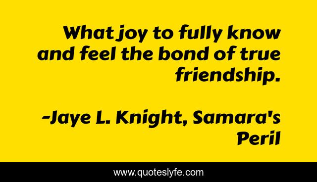 This page presents the quote "What joy to fully know and feel the bond of true friendship.". Author of this quote is Jaye L. Knight, Samara's Peril. This quote is about joy, friendship, bond,.