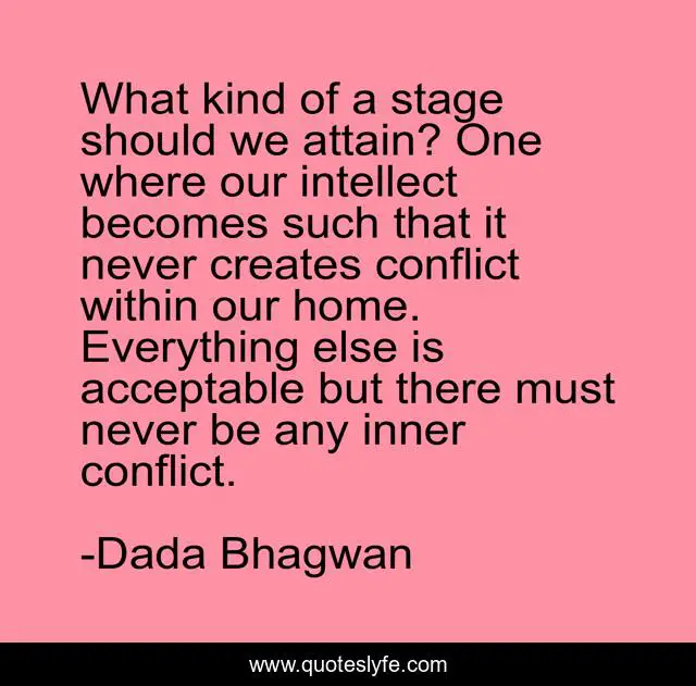 This page presents the quote "What kind of a stage should we attain? One where our intellect becomes such that it never creates conflict within our home. Everything else is acceptable but there must never be any inner conflict.". Author of this quote is Dada Bhagwan. This quote is about intellect, spiritual, acceptable, conflict, attain,.