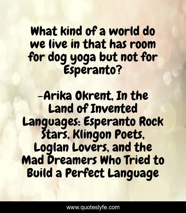 This page presents the quote "What kind of a world do we live in that has room for dog yoga but not for Esperanto?". Author of this quote is Arika Okrent, In the Land of Invented Languages: Esperanto Rock Stars, Klingon Poets, Loglan Lovers, and the Mad Dreamers Who Tried to Build a Perfect Language. This quote is about injustice, esperanto, dogs, yoga-practice,.