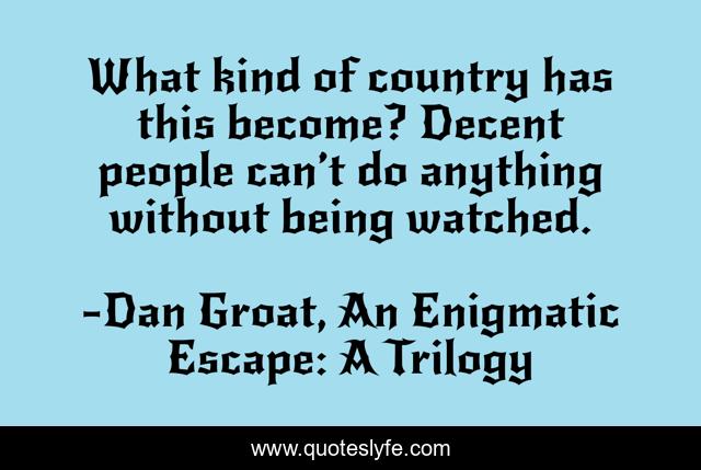 This page presents the quote "What kind of country has this become? Decent people can’t do anything without being watched.". Author of this quote is Dan Groat, An Enigmatic Escape: A Trilogy. This quote is about big-brother, country, big-brother-is-watching, decent,.