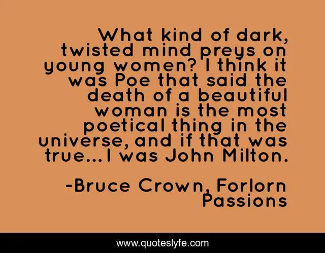 This page presents the quote "What kind of dark, twisted mind preys on young women? I think it was Poe that said the death of a beautiful woman is the most poetical thing in the universe, and if that was true… I was John Milton.". Author of this quote is Bruce Crown, Forlorn Passions. This quote is about death, john, predator, edgar, beautiful-woman, prey, allen, murder, poe,.