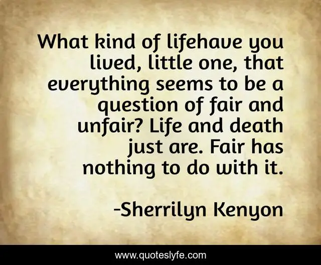 This page presents the quote "What kind of lifehave you lived, little one, that everything seems to be a question of fair and unfair? Life and death just are. Fair has nothing to do with it.". Author of this quote is Sherrilyn Kenyon. This quote is about life, death, fair,.