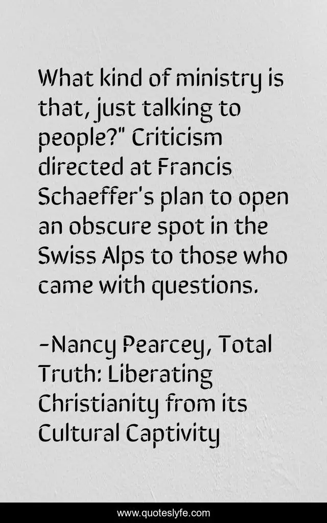 This page presents the quote "What kind of ministry is that, just talking to people?" Criticism directed at Francis Schaeffer's plan to open an obscure spot in the Swiss Alps to those who came with questions.". Author of this quote is Nancy Pearcey, Total Truth: Liberating Christianity from its Cultural Captivity. This quote is about discipleship, obscurity, humility, ministry,.